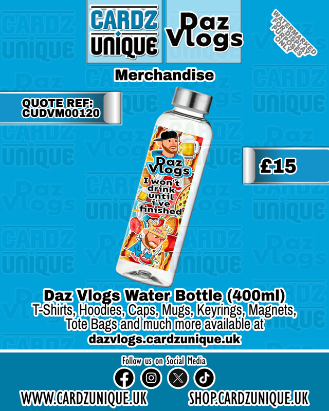 We are delighted to be working in collaboration with Daz Vlogs offering an exclusive range of bespoke merchandise from the 'Merchandise by Cardz Unique The Collection' offering one-of-a-kind, custom-made and super special and limited edition products, completely bespoke and available with any image, brand or message.